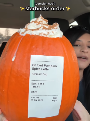 β β ν΄μΈμμ κ°μ μμ¦ λν λ©λ΄ Pumpkin Spice Latte(PSL)λ₯Ό μ§μ§ νΈλ° μμ λ΄μ λ§μλ λ° νΈλ λκ° νμ° μ€ β β’ μλλͺ¬Β·λλ©κ·ΈΒ·ν΄λ‘λΈ ν₯μ΄ νΉμ§μΈ PSLμ λ§€λ